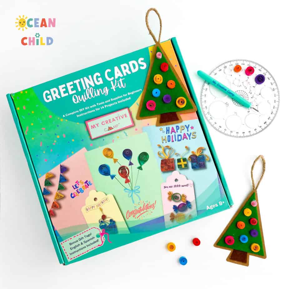 You can easily gather these supplies at home or use a paper quilling starter kit (like the one from My Creative Camp), which includes colorful strips, tools, glue, and blank cards, ideal for beginners.