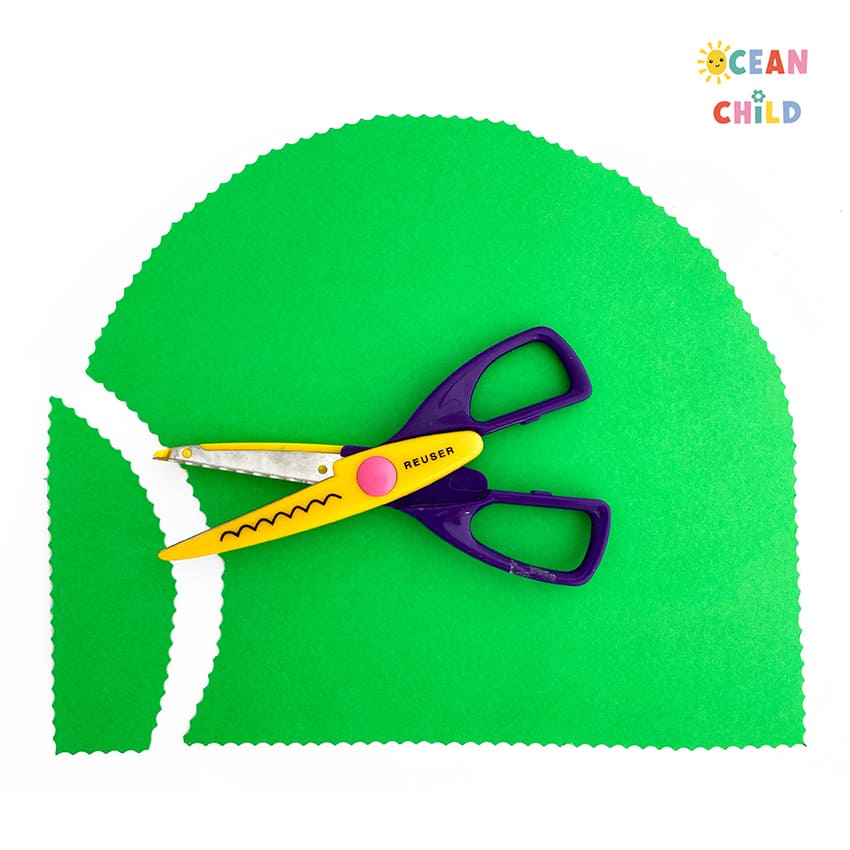 Step 3: Before we will glue the hedgehog together. We´re going to make the body of the hedgehog green. For this, you can use green paper (like you see in the picture) or paint the body green. We used zigzag scissors to give the hedgehog a zigzag border, but this is optional.