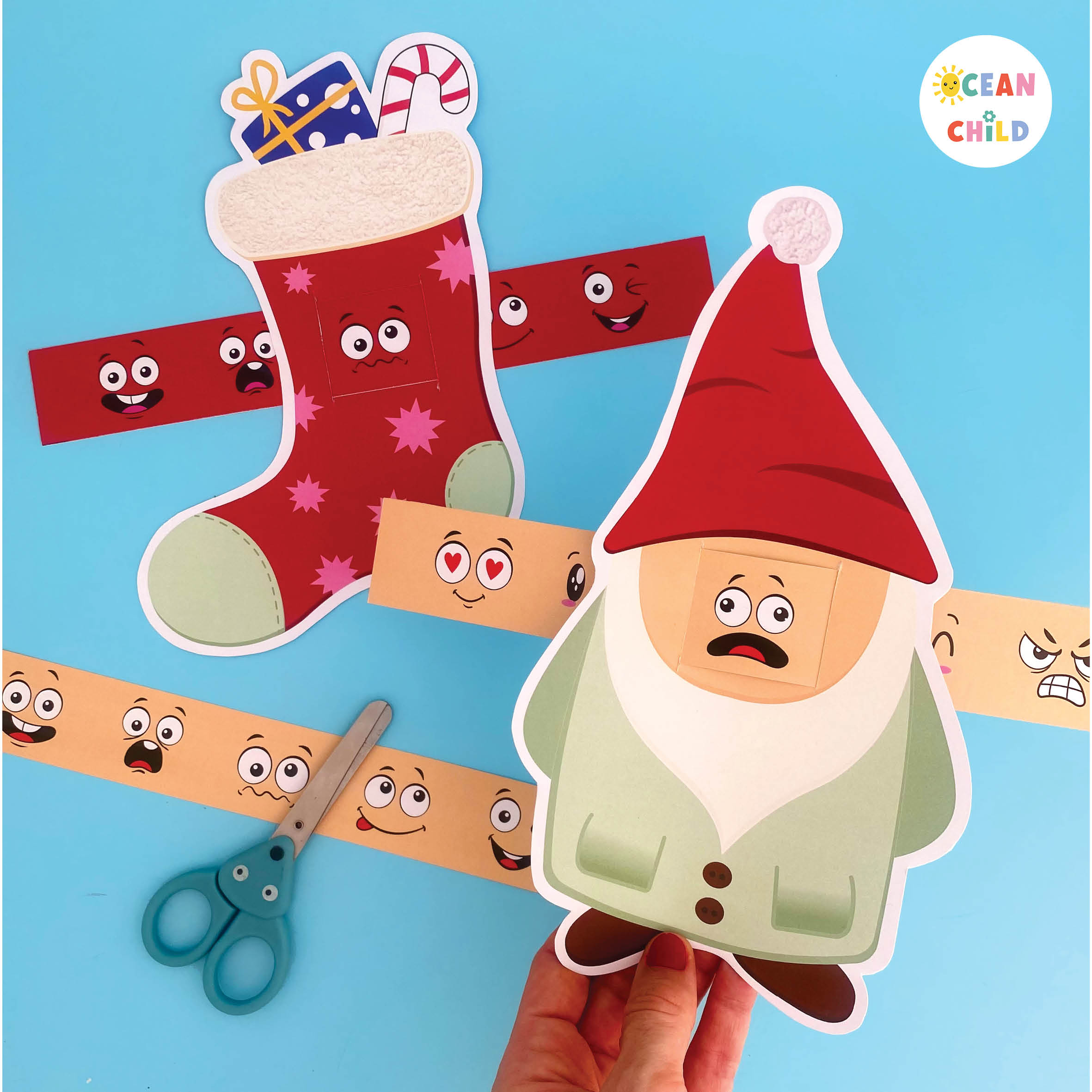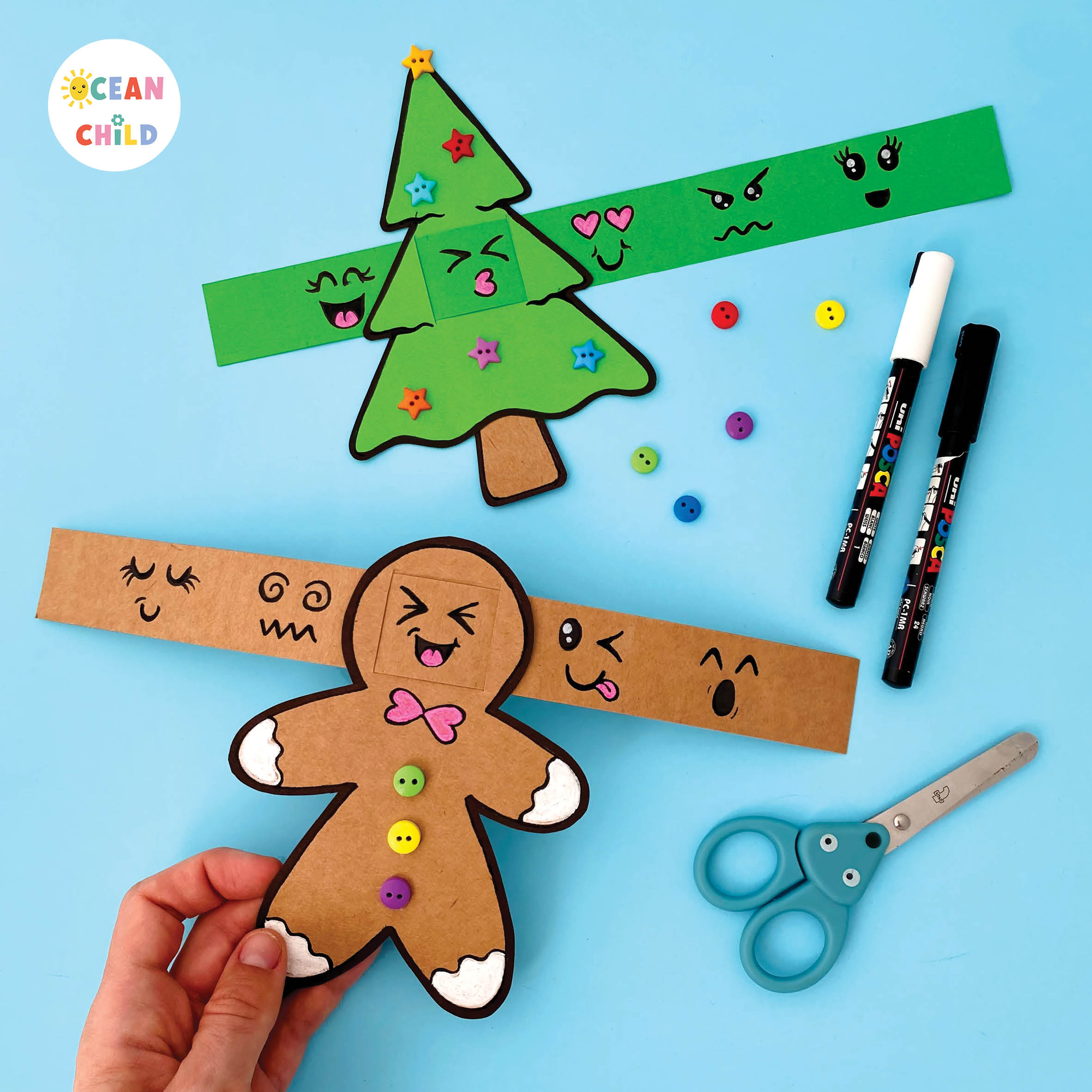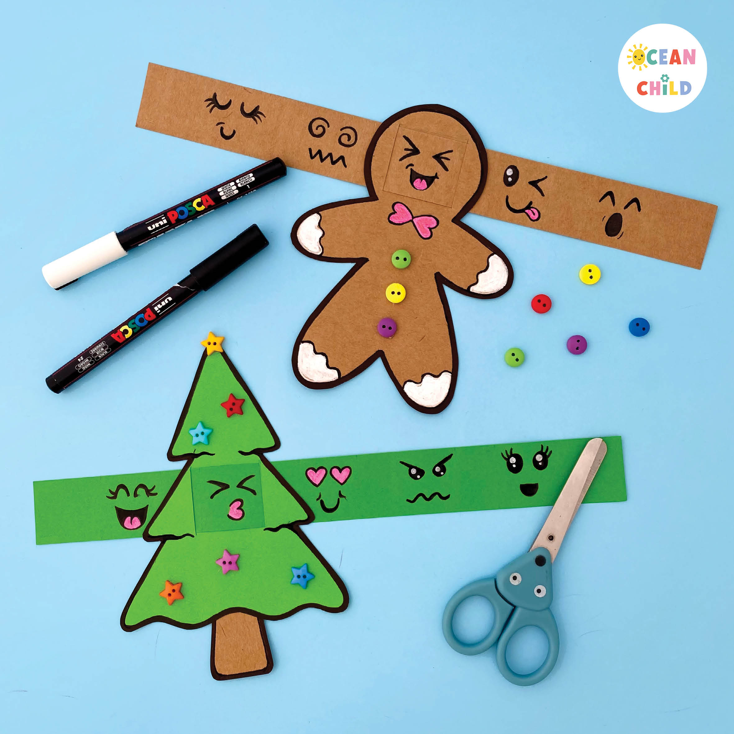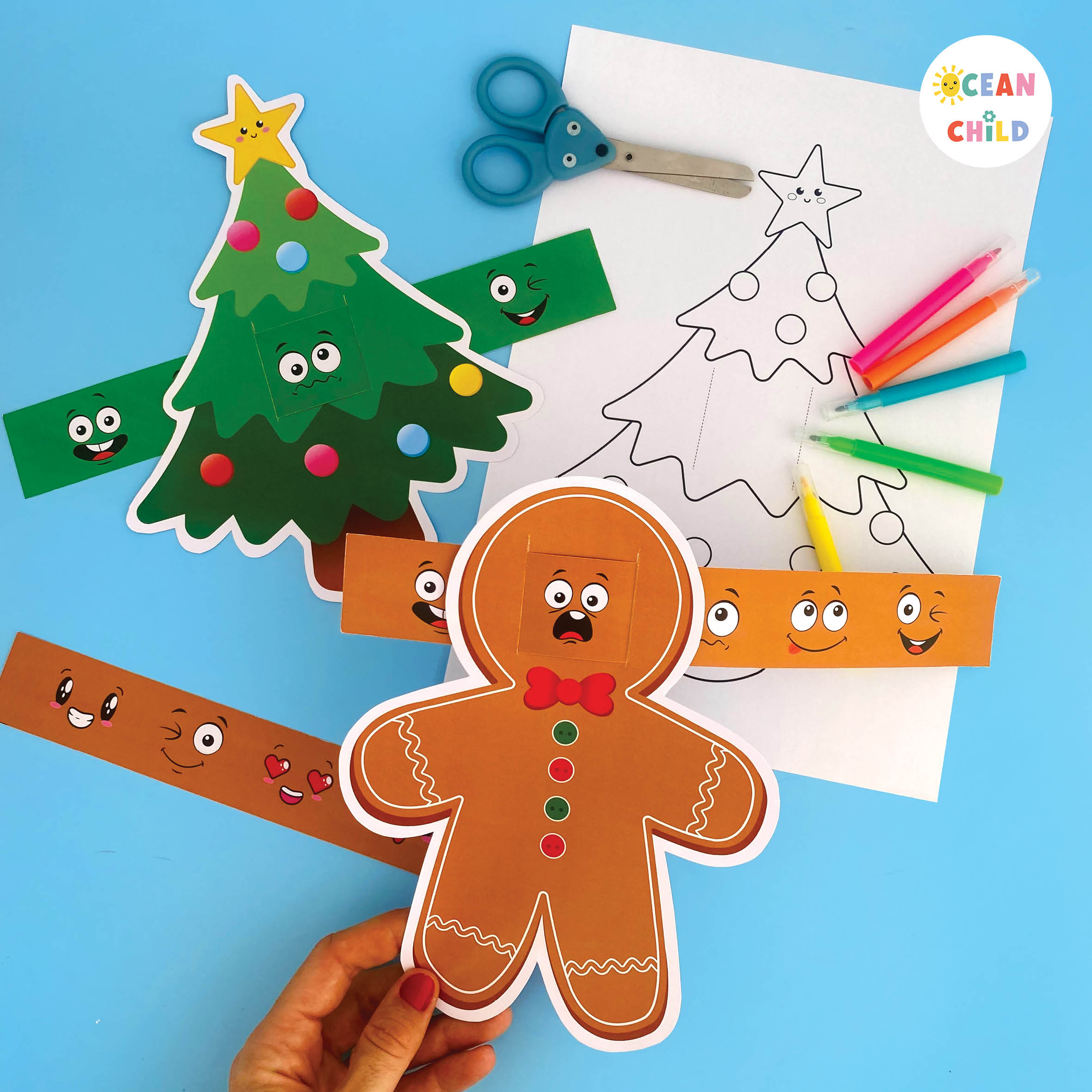 This adorable Christmas paper puppet activity lets children design their own gingerbread cookies and Christmas trees, complete with moving expressions. Kids love sliding the paper strips through their puppets to reveal happy, silly, or surprised faces.