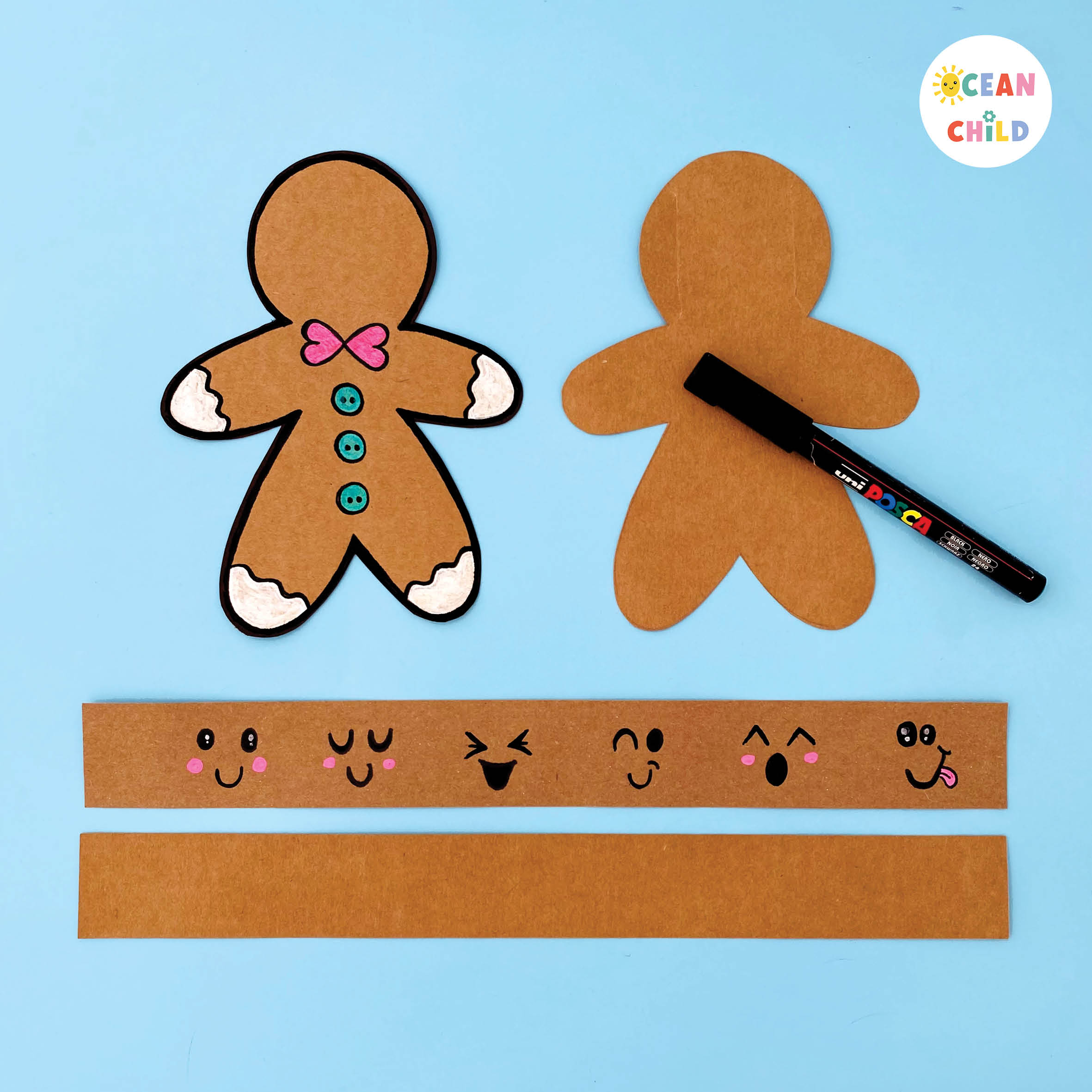Slide the emotion strip through the two cuts in your gingerbread man’s face. When you pull the strip, your gingerbread cookie will show different expressions. This step is especially fun for younger children who love to see the faces change.