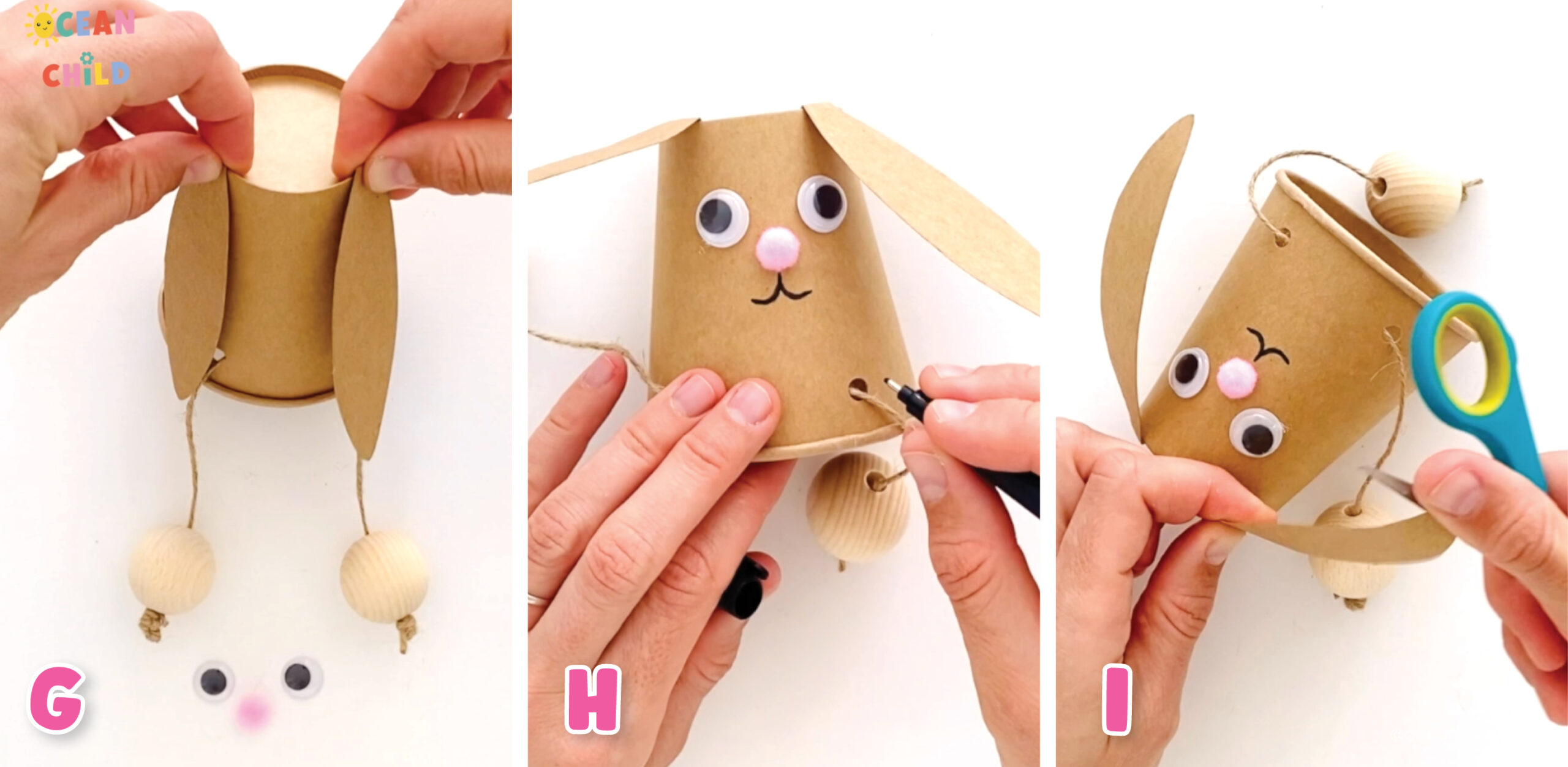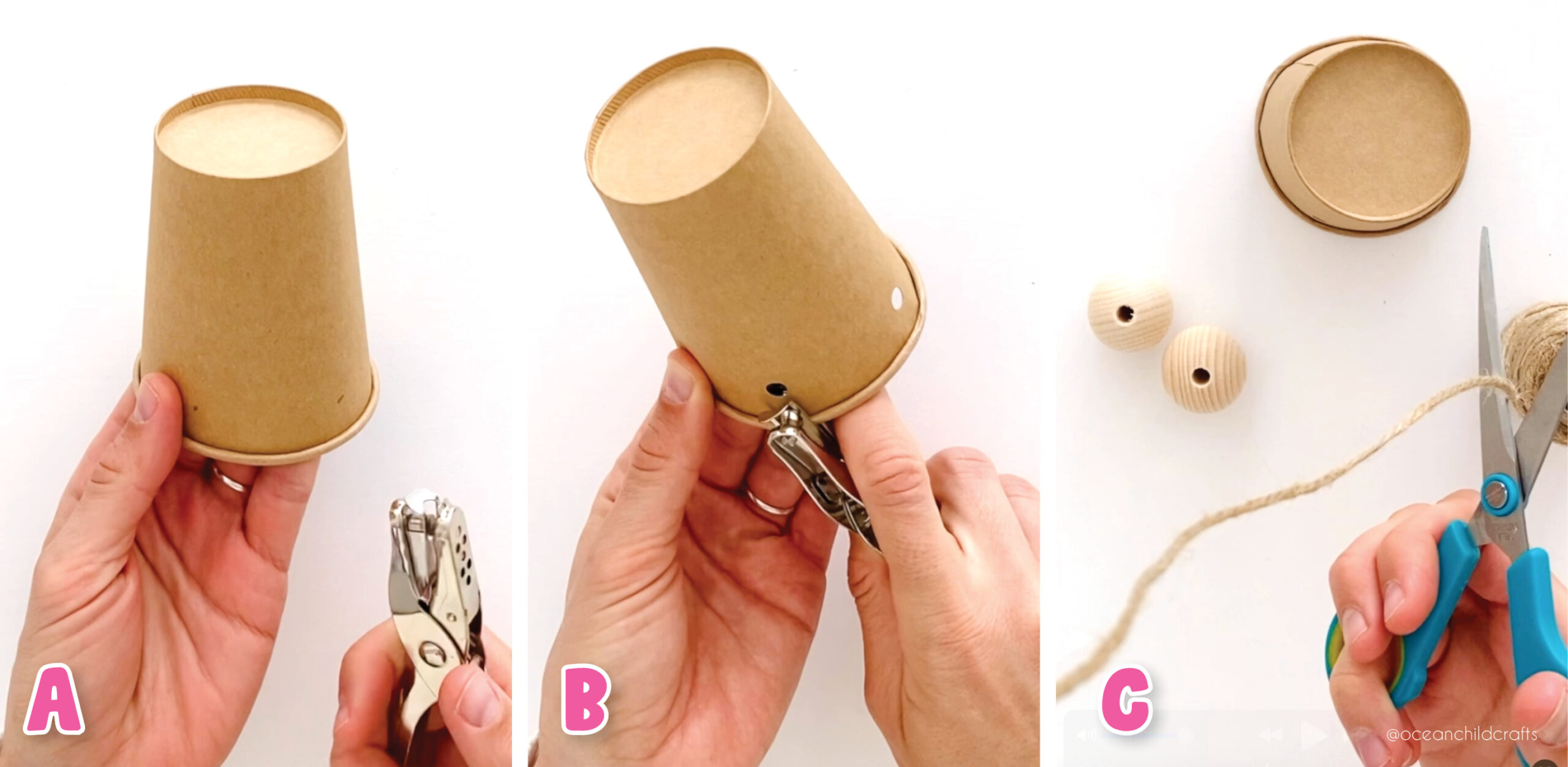 Use a hole punch to make two holes near the lower part of the cup. Space them about 4 cm apart so the legs hang nicely and the bunny can stand or dangle evenly.