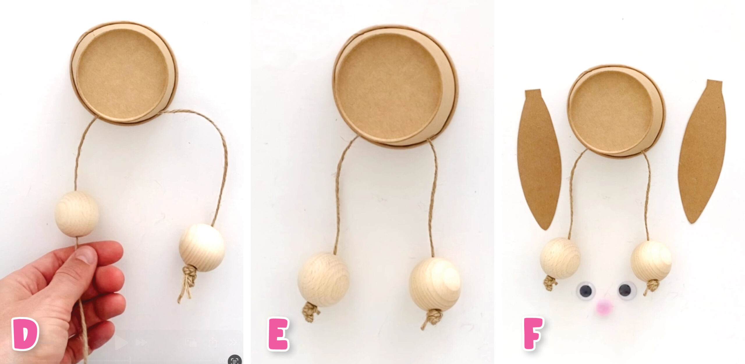 Now thread the twine up through one hole and back down through the other hole. Add the second wooden bead to the other end and tie a knot to secure it in place. You should now have two dangling bunny legs with wooden bead feet.
