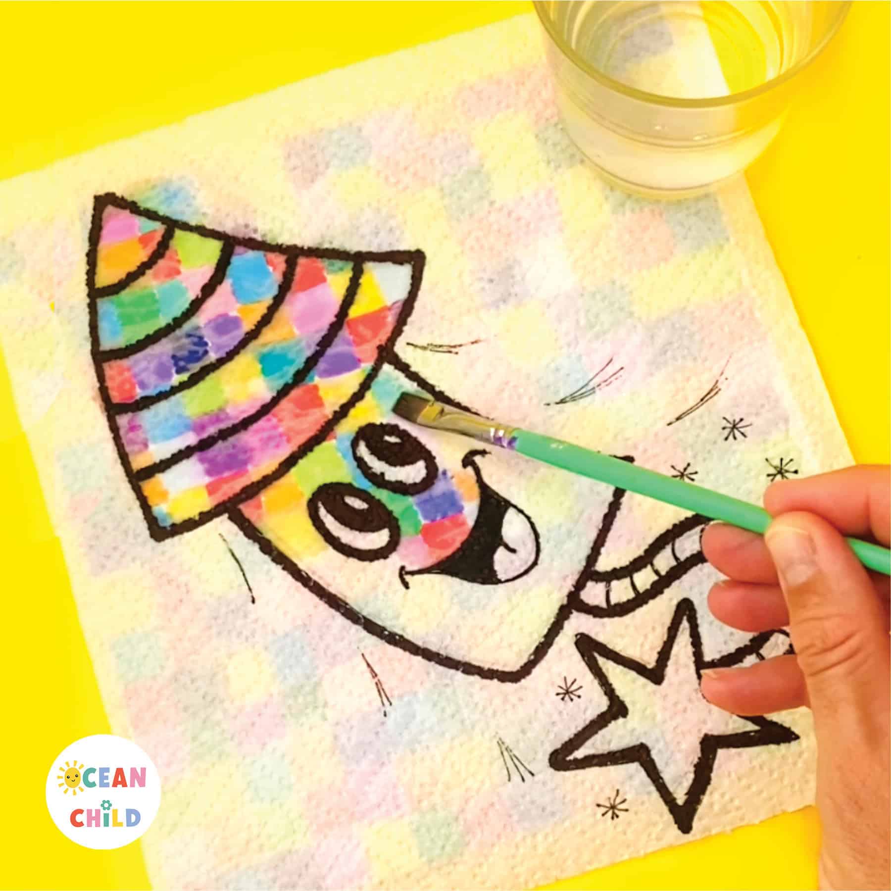 Once each child has created their colorful backdrop, give each student a paper towel and a black permanent marker for them to draw on. You can choose a theme, such as animals, nature, a New Year’s Eve party, hobbies, etc., or let them create their designs. Something that reminds them of their classmate, for example.