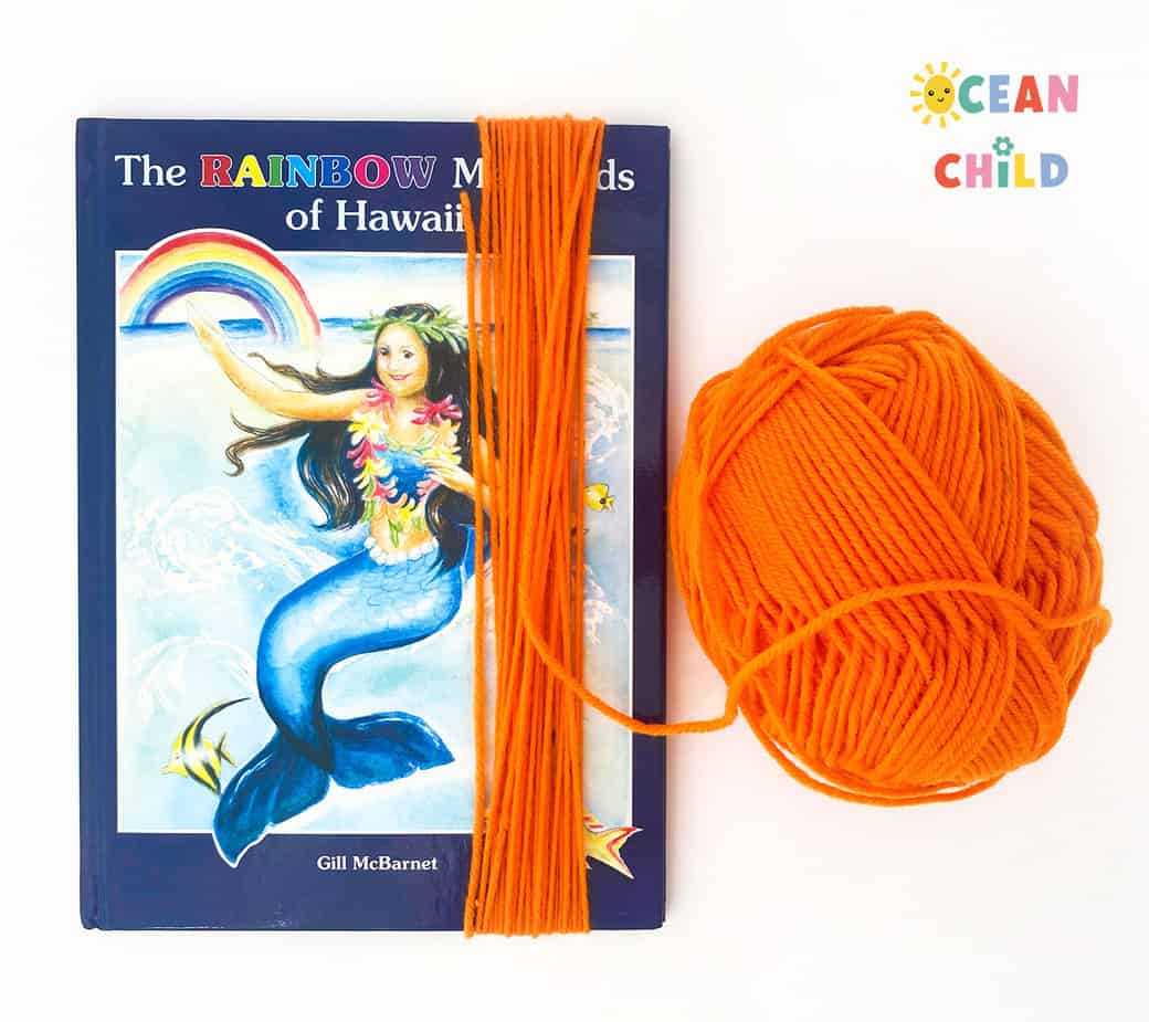 Step 10: We will make the mermaid’s hair with yarn. You can use any color you like. To make the hair, wrap the yarn around a book about 10 inches (25 CM) high. We used The Rainbow Mermaids of Hawaii. Wrap your yarn 30 times around the book; see the picture.