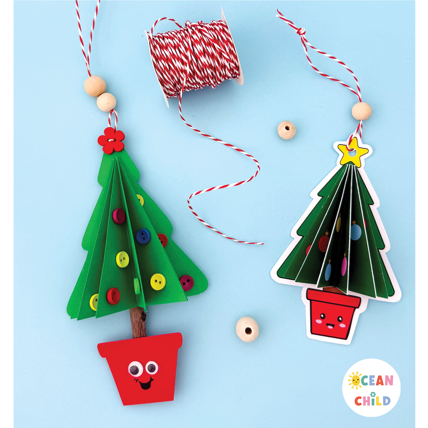 Punch a small hole at the top of your tree. Thread through a piece of ribbon or twine and tie a knot. We used this festive red and white cotton twine. You can even add a few wooden beads for an extra festive touch. See images below!