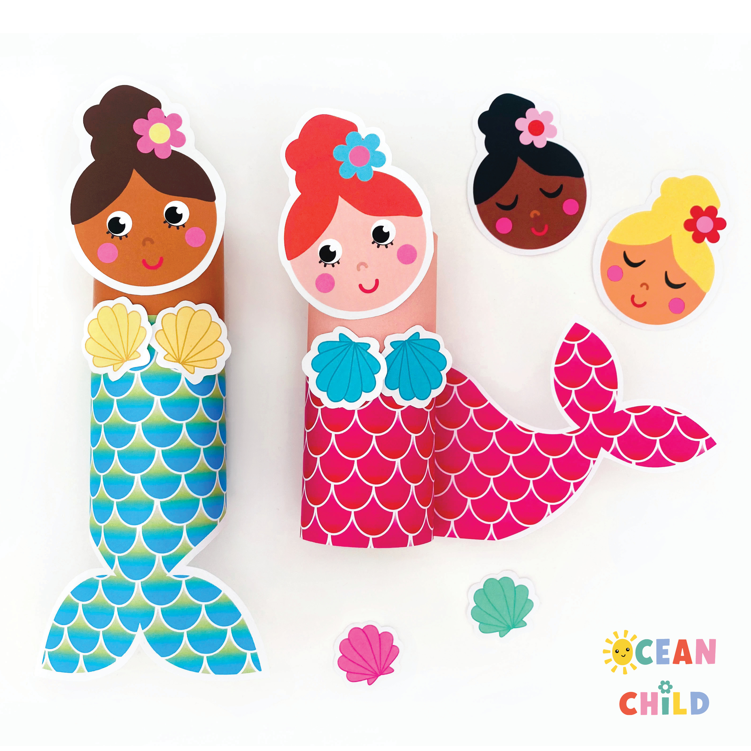 Print and assemble a mermaid using a paper tube and colorful mermaid tail templates. See image below. Printable bundle comes in color and includes coloring pages. This magical ocean-themed craft is perfect for imaginative kids and birthday parties. Find the full mermaid printable bundle right here.