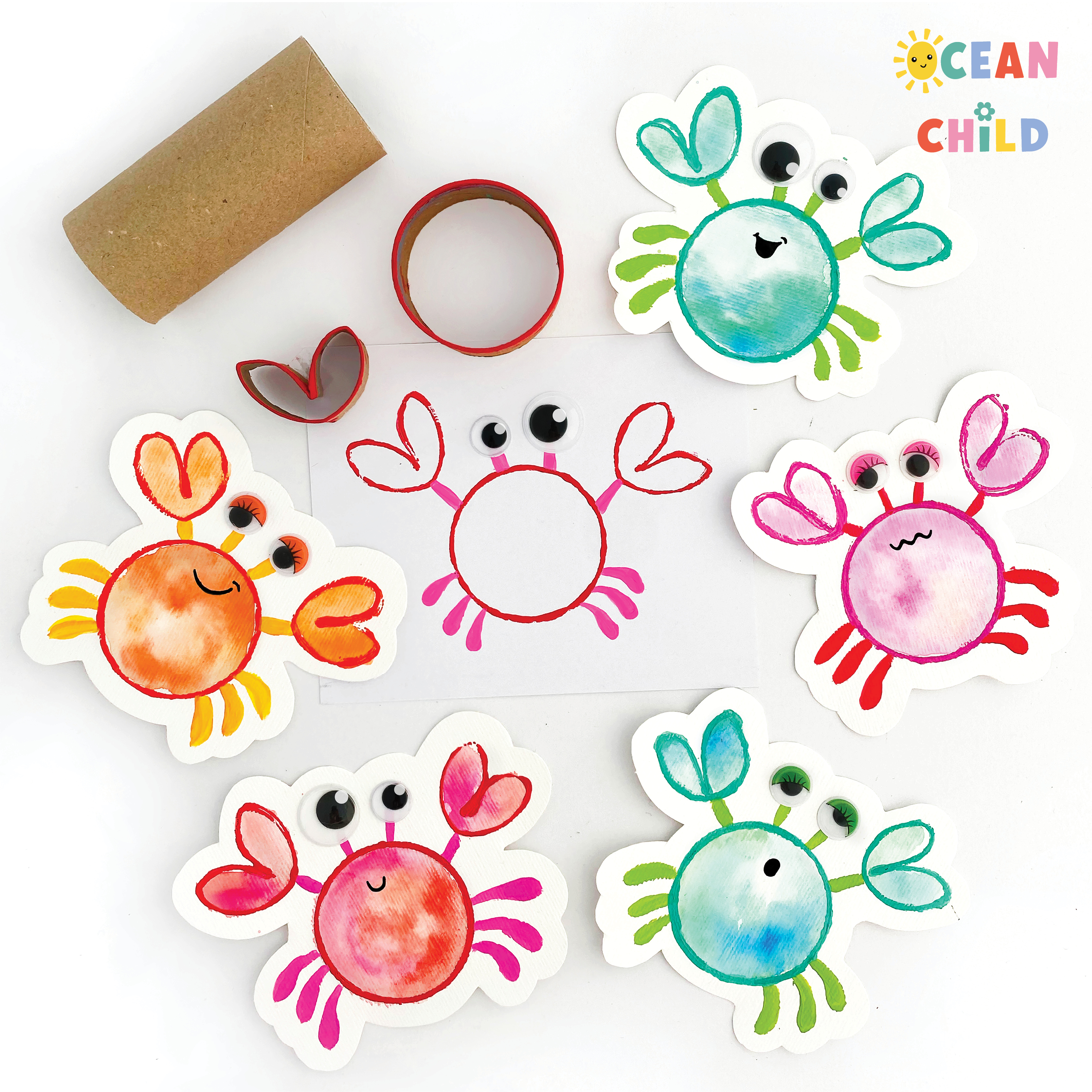 Stamp colorful crabs with a paper roll and paint for a fun beach-themed craft. This easy ocean animal craft is perfect for summer art time. See image below.