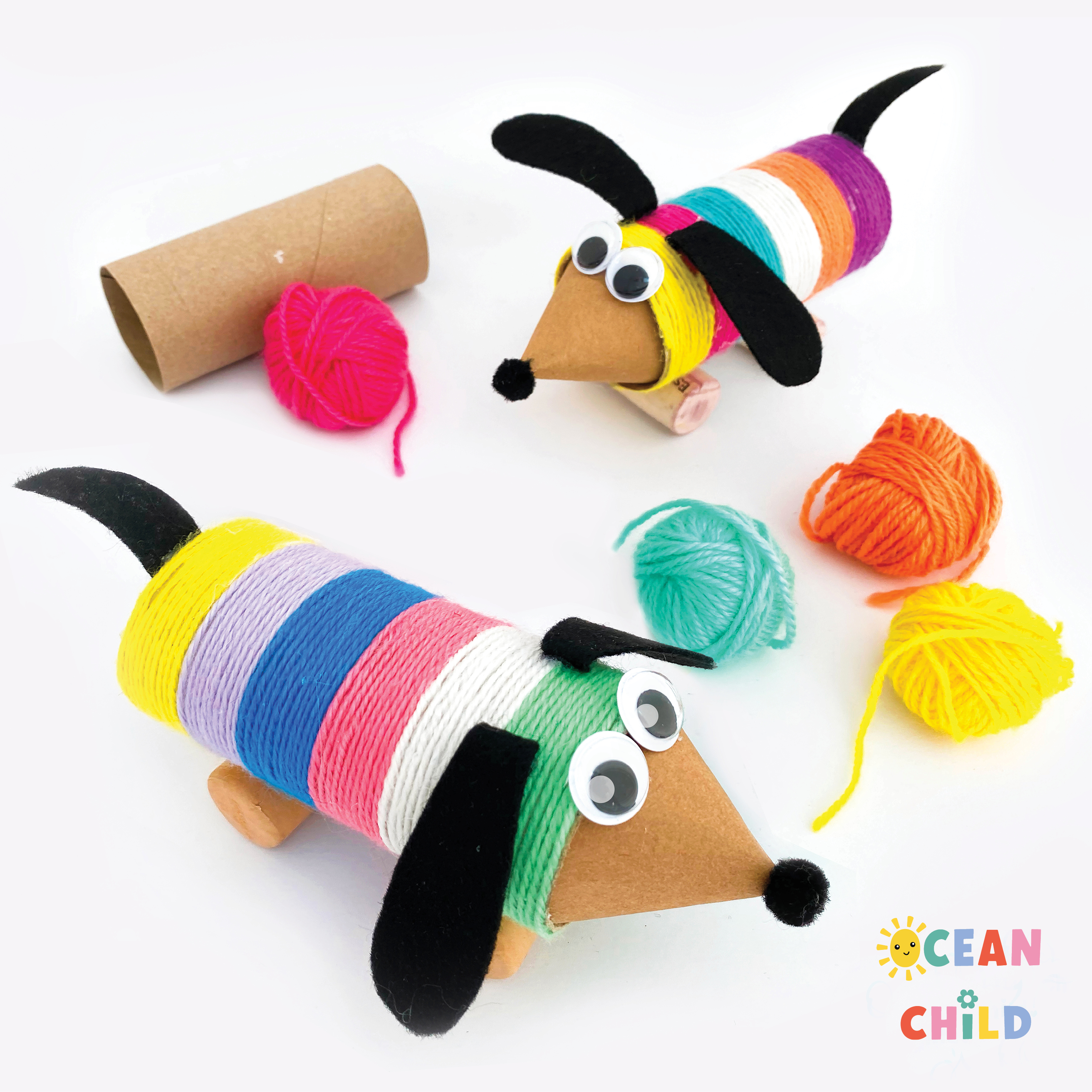 Create a cute dachshund using a toilet paper roll and colorful yarn for an adorable DIY dog craft. This recycled craft is perfect for kids who love animals or a pet-themed lesson. See image below.
