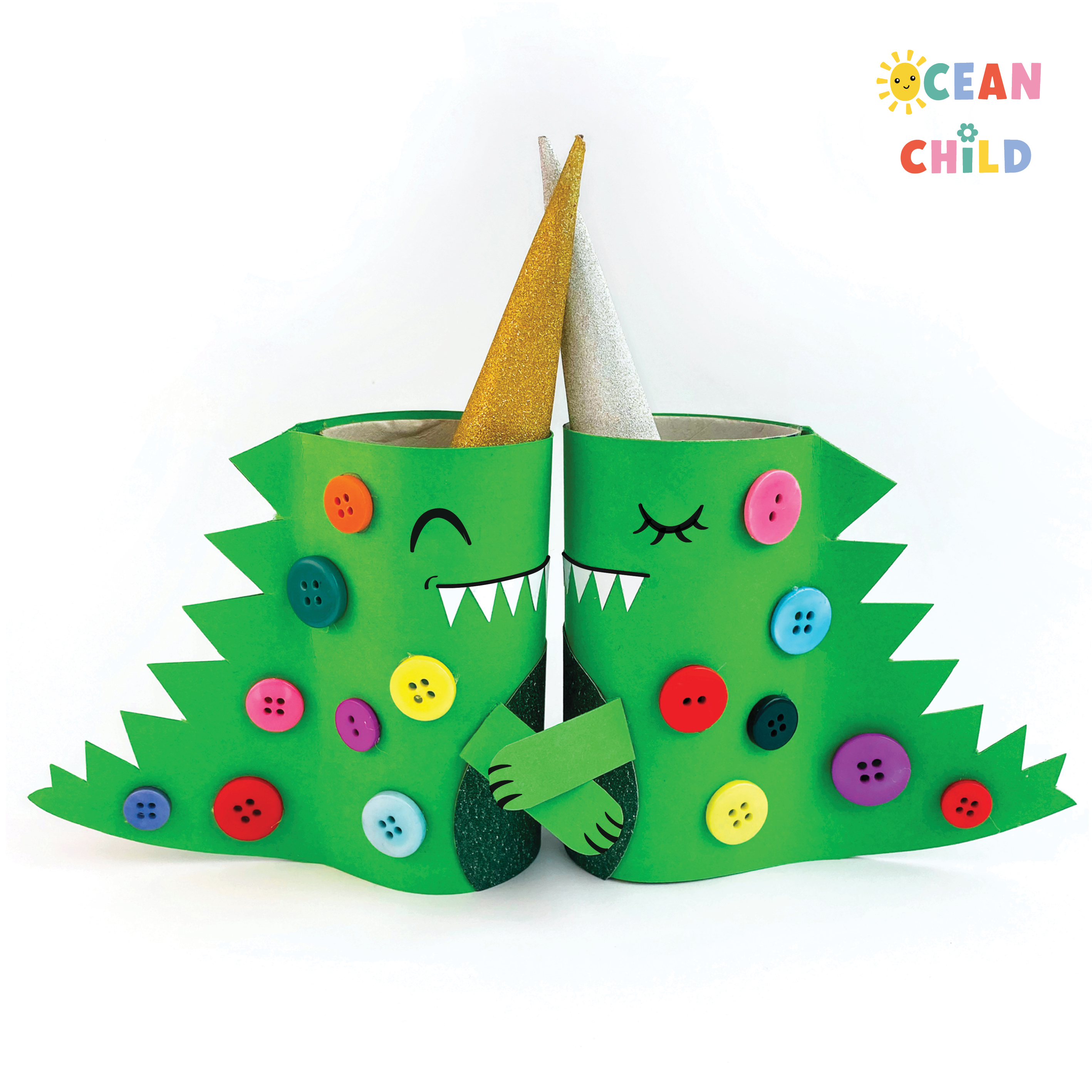 Craft a dinosaur with a Christmas tree body using paper rolls. See image above. This clever holiday dinosaur craft blends Christmas cheer with prehistoric fun. You can decorate your dino tree with buttons and beads.