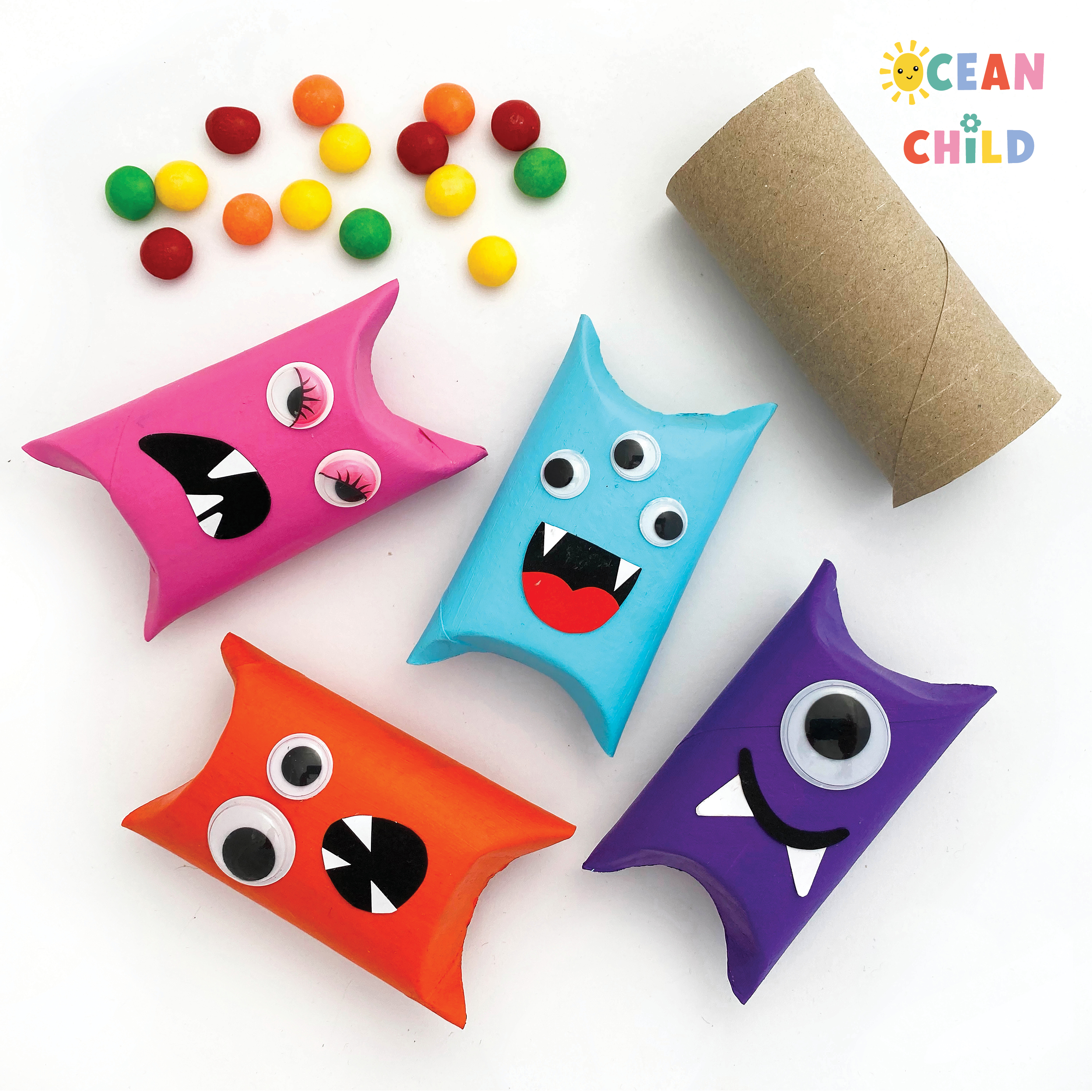 Create spooky Halloween treat boxes from toilet paper rolls. See image above. We gave our monsters funky colors, googly eyes, and pointy teeth. This easy Halloween craft doubles as party favors or trick-or-treat holders.