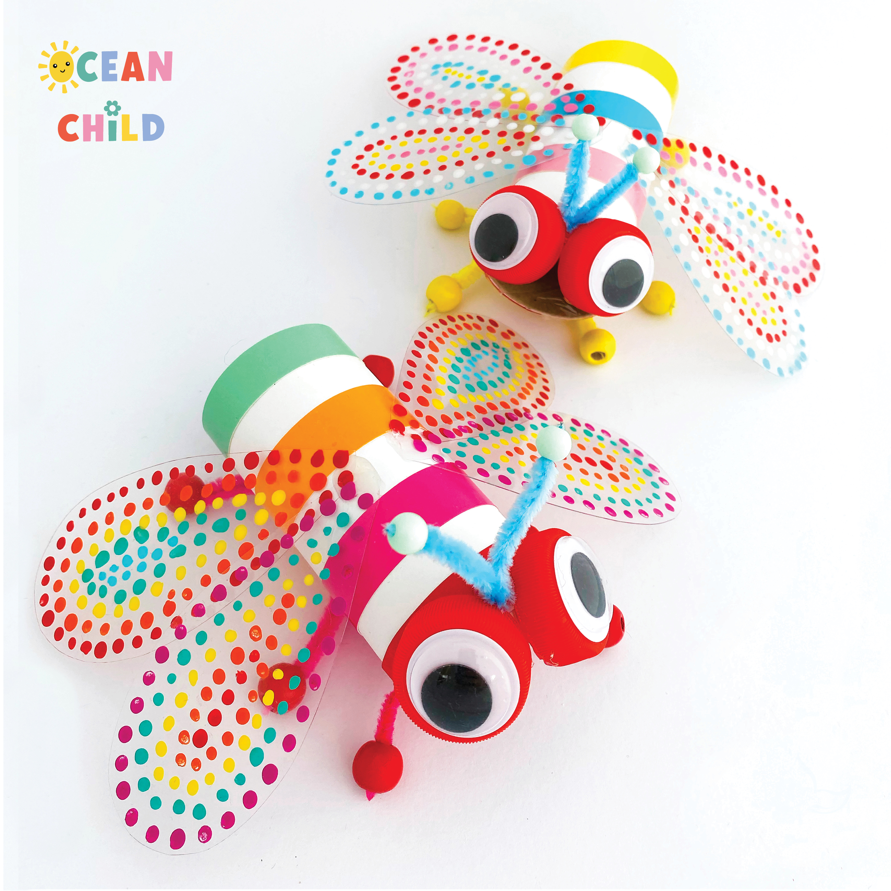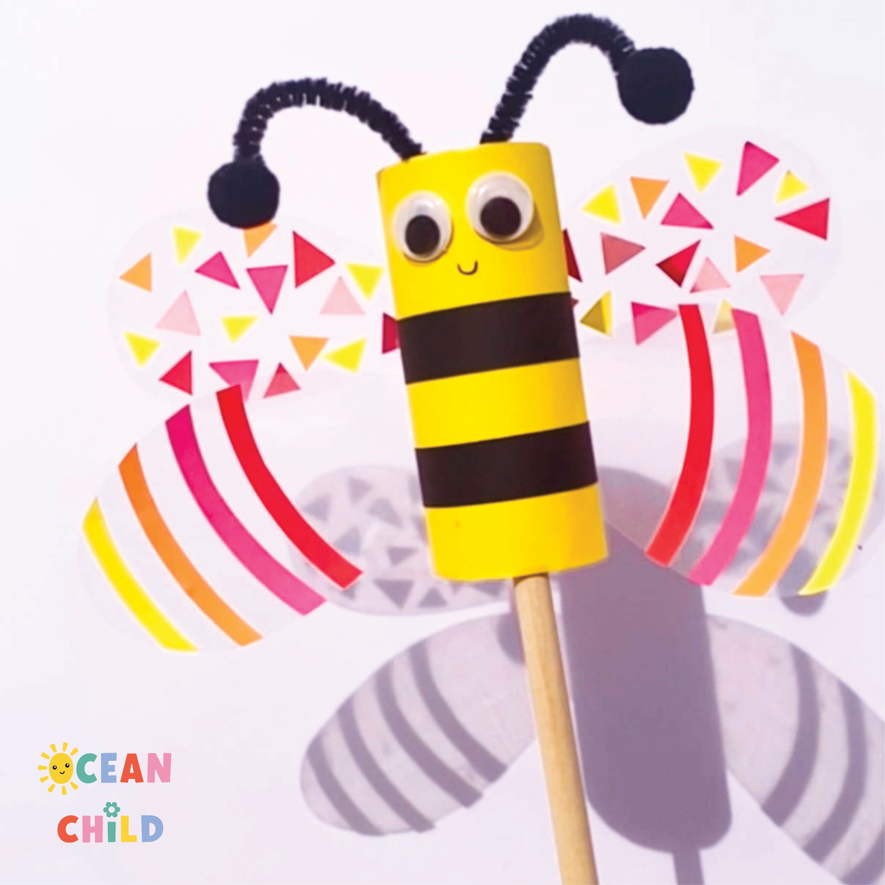 Make a bee with transparent wings using recycled materials and paper rolls. This insect craft is perfect for summer fun and pollinator education. See image below.
