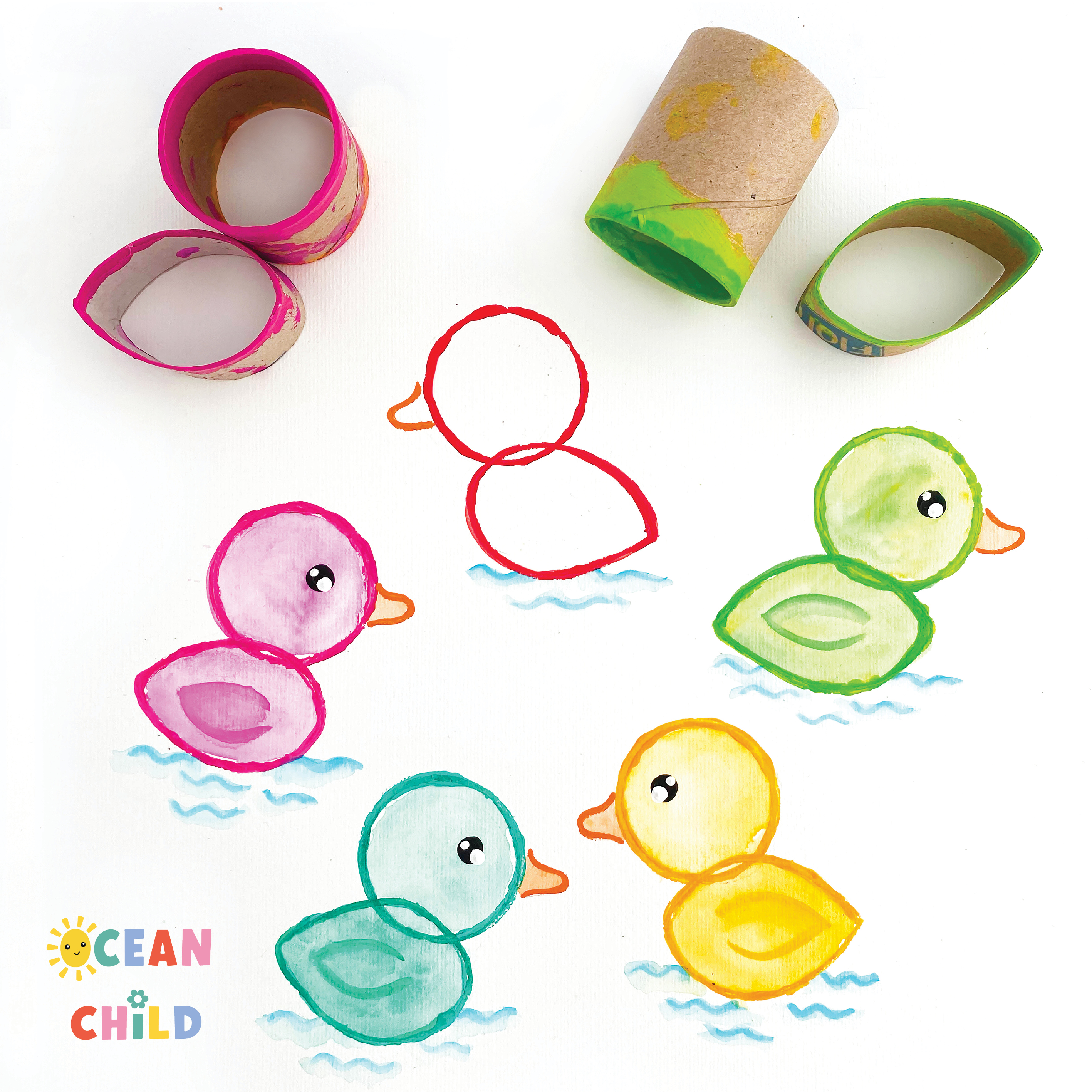 Make duck stamps using the end of a toilet paper roll and paint. This easy craft is ideal for toddler sensory play and farm animal units. See image below.