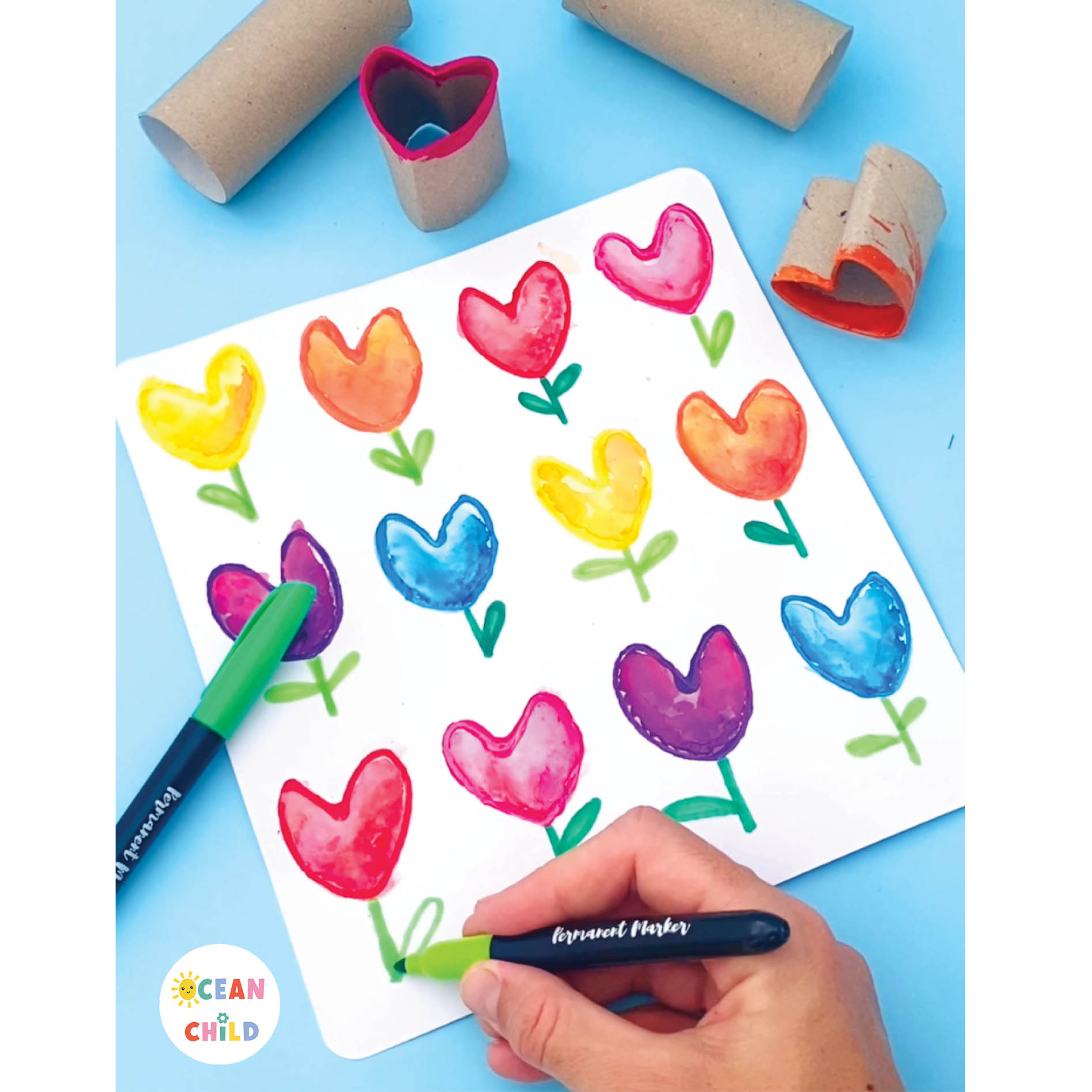 Create flower stamps in heart shapes using cut paper rolls and bright paint. See image above. This very easy and creative stamping activity is perfect for Valentine’s Day or Mother’s Day.
