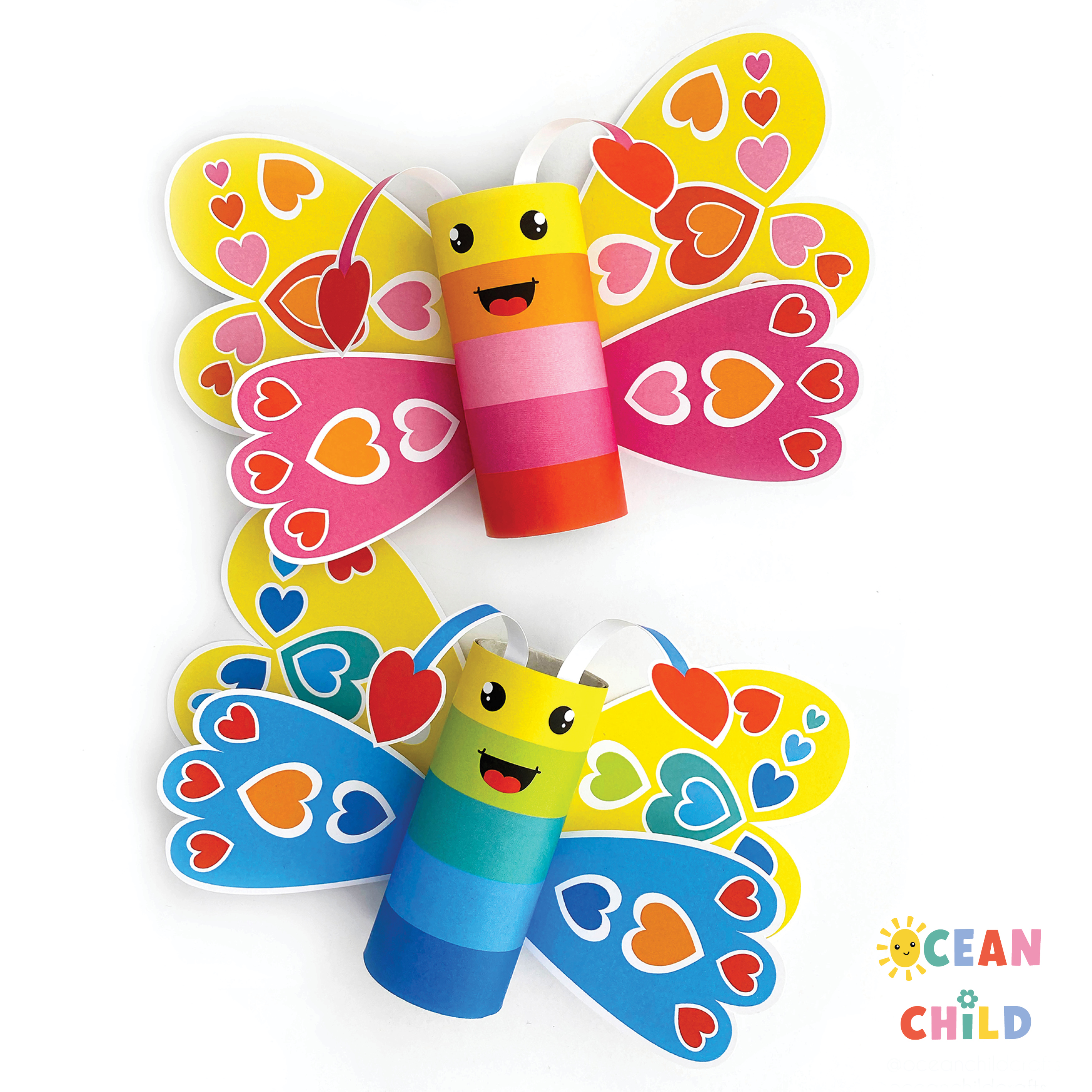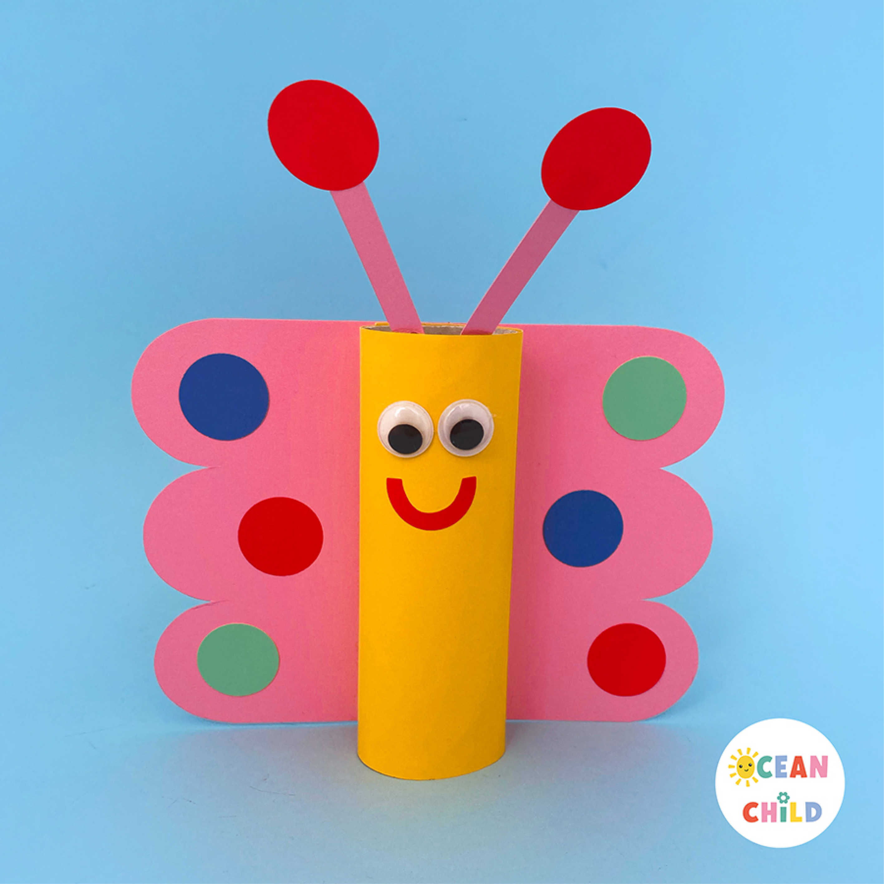 Print and assemble a cute butterfly around a paper roll using a printable template. See image below. This simple craft is great for spring and bug-themed learning. You can find the printable bundle (in color and coloring page) right here.