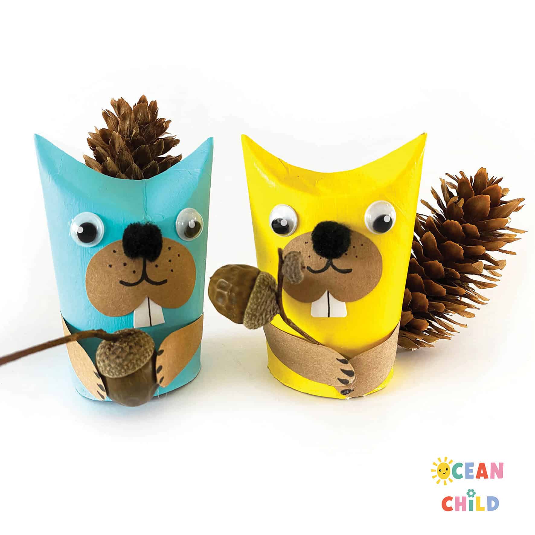 8. Paper Roll Squirrels with Fluffy Pinecone Tails