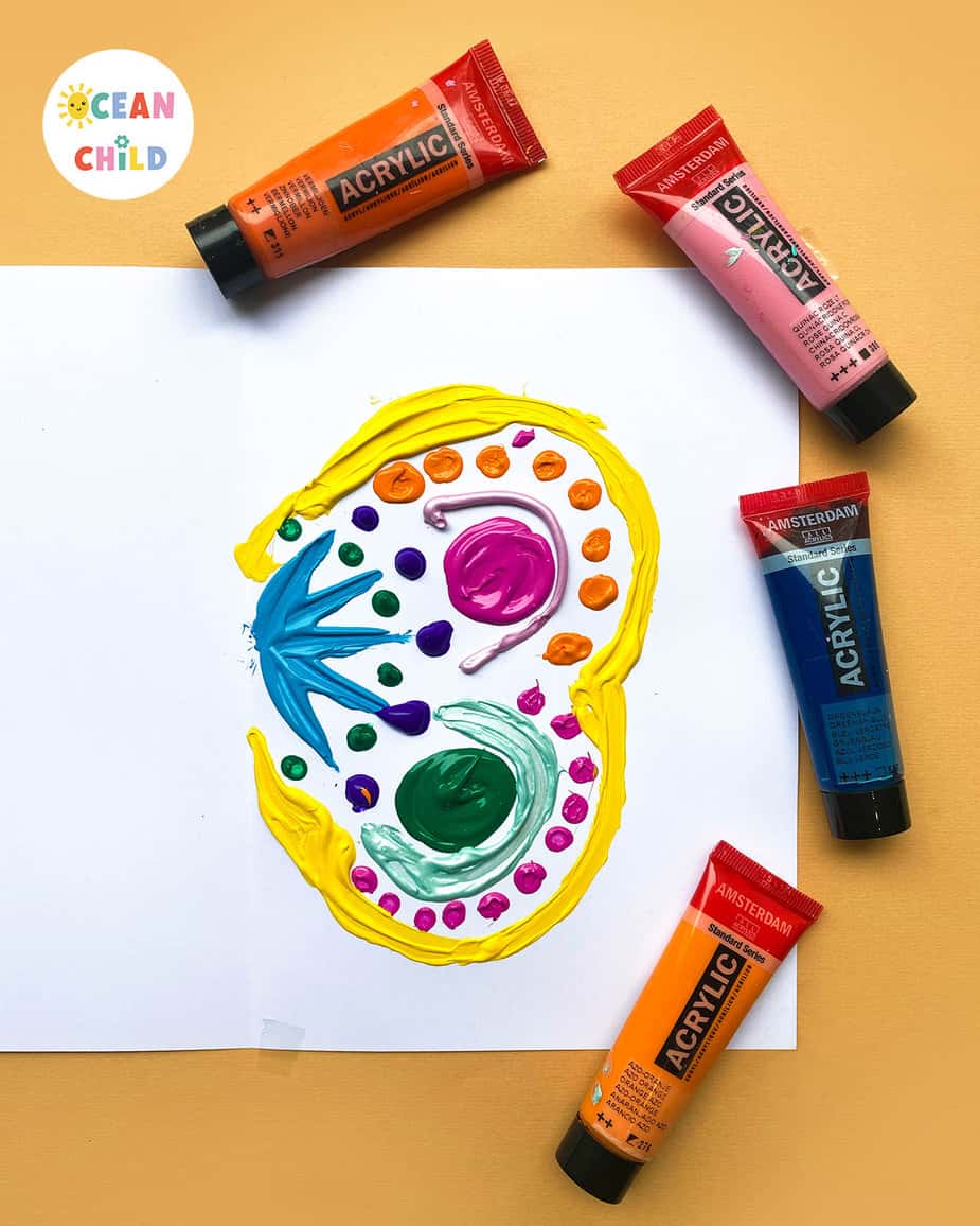 Fold a sheet of thick white paper in half. Open it back up and add drops of bright acrylic paint on one half of the paper, preferably near the center edge. You can use a brush or squeeze the paint directly from the tube. See the picture below for reference.