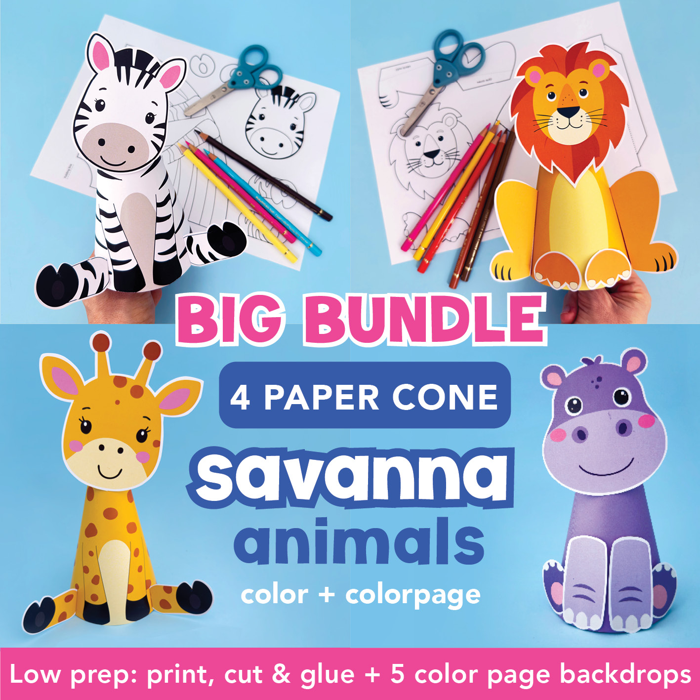 Bring animal-themed learning to life with this Savanna (African) Animals Craft Bundle! This low-prep printable set includes four adorable paper cone animal crafts: zebra, lion, giraffe, and hippo, perfect for preschool, kindergarten, and early elementary students.
