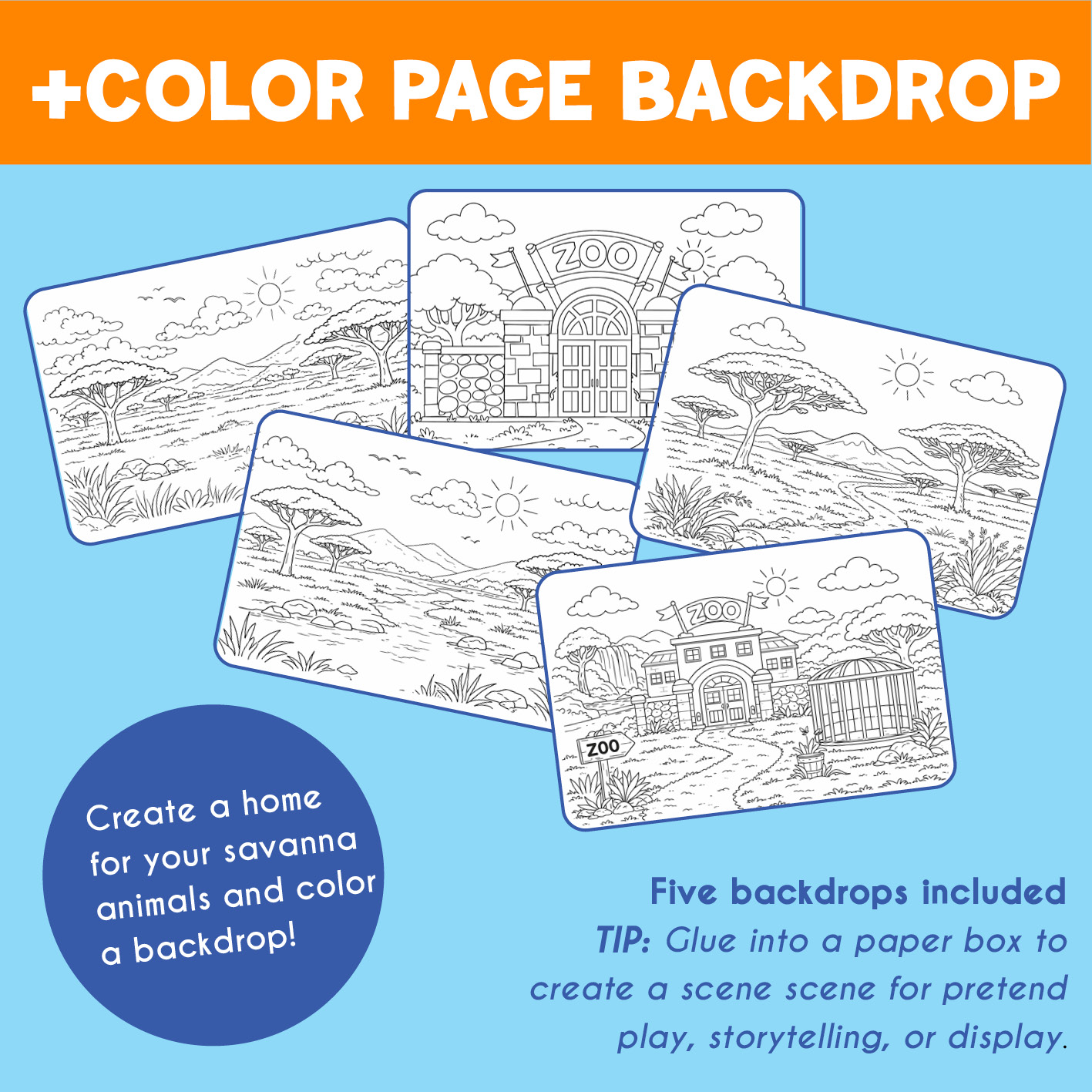 – 5 printable color page backdrops (zoo & savanna themes)