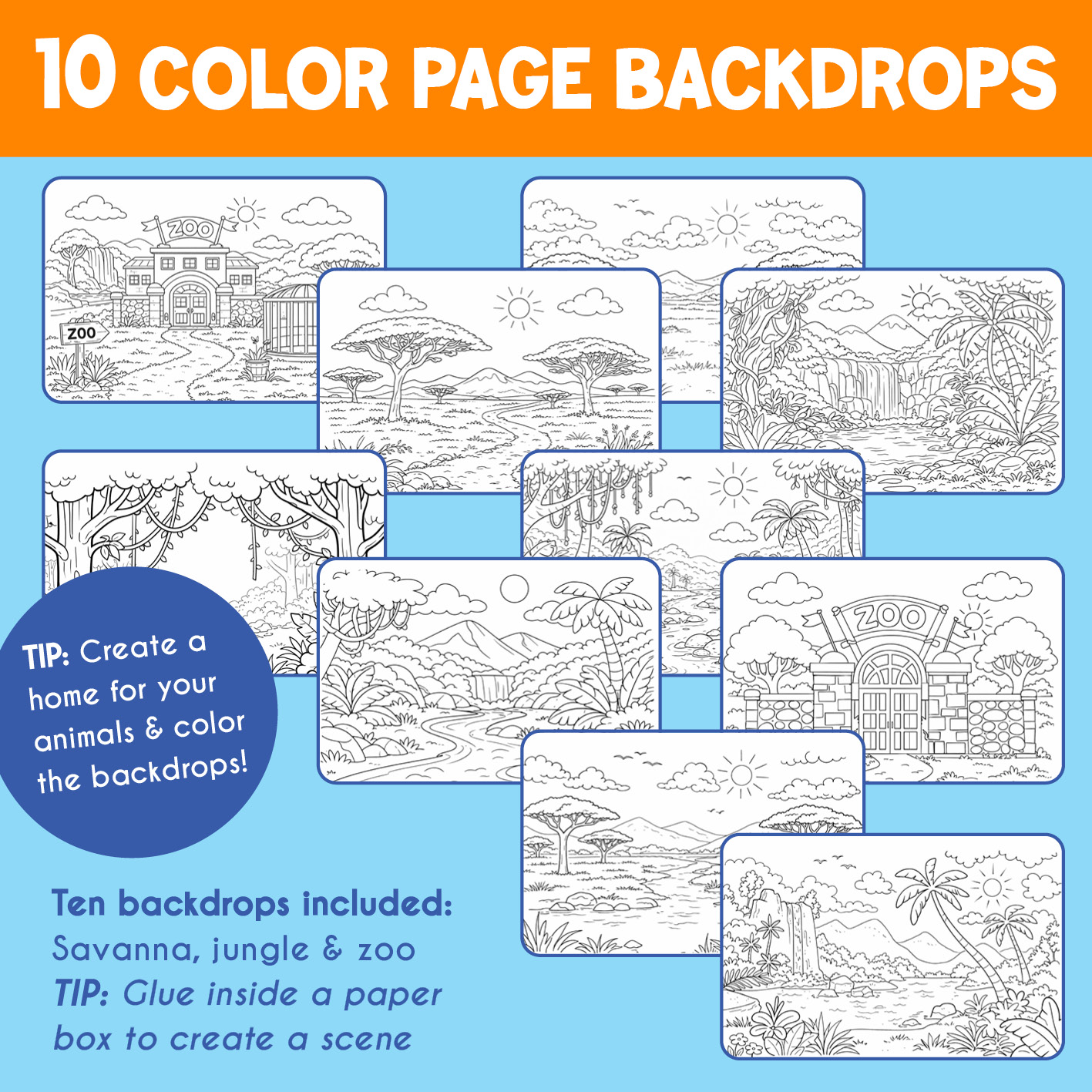 • 10 Coloring page backdrops (savanna, jungle, zoo, nature scenes)