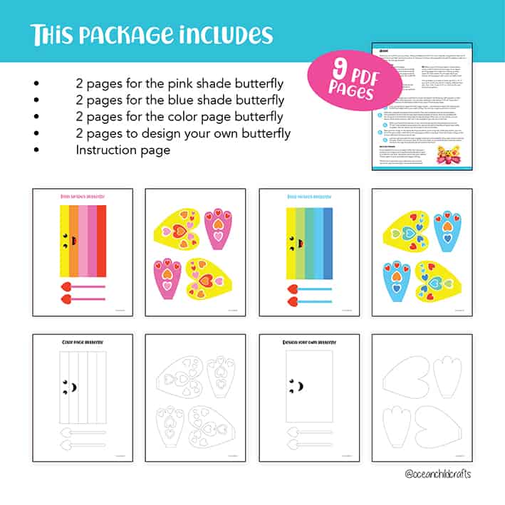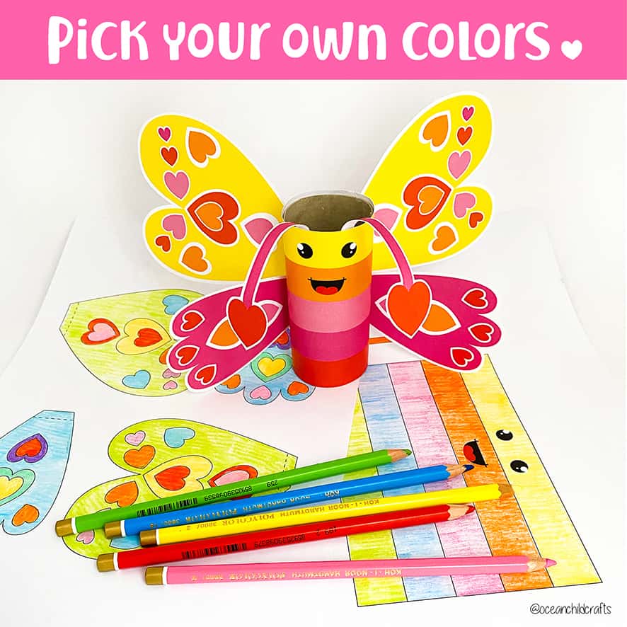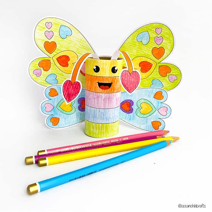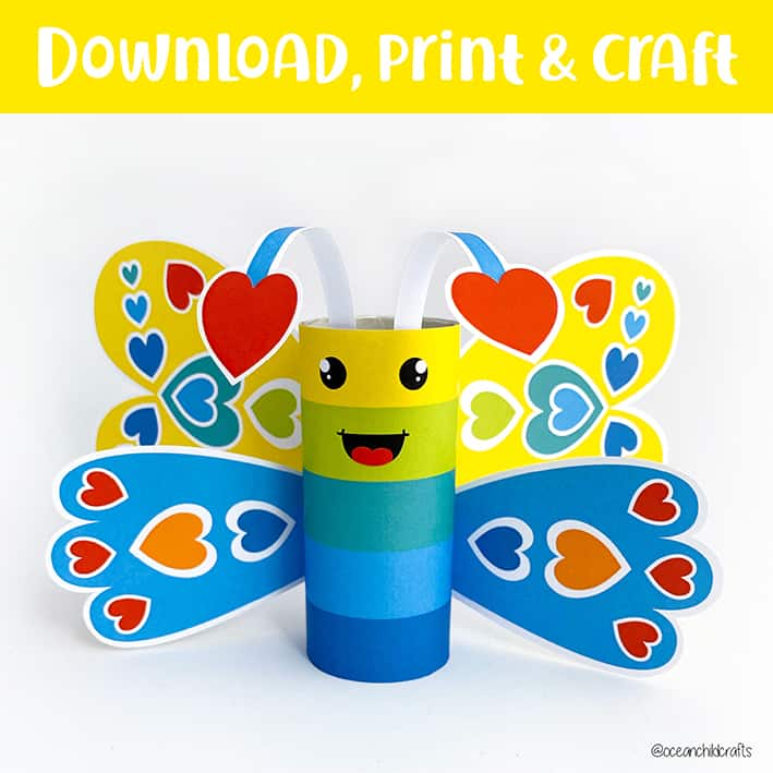 Cute paper roll butterfly craft printable for kids! This butterfly template is full of creative fun and gives the kids lots of opportunity to personalize it. You’ll end up with beautiful artwork to display or gift to a loved one on Valentine’s Day. You’ll receive four different butterfly templates in color and as a butterfly coloring page.