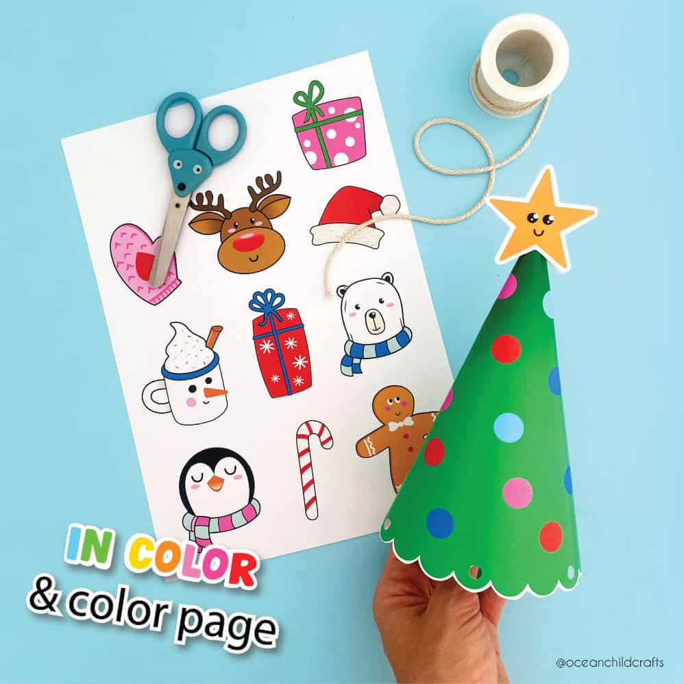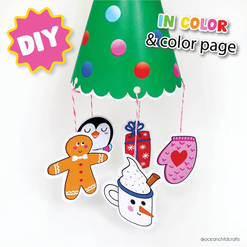 Try out this fun Christmas Tree Mobile craft printable activity with kids! This festive craft activity allows kids to create a paper cone Christmas tree and turn it into a festive mobile.