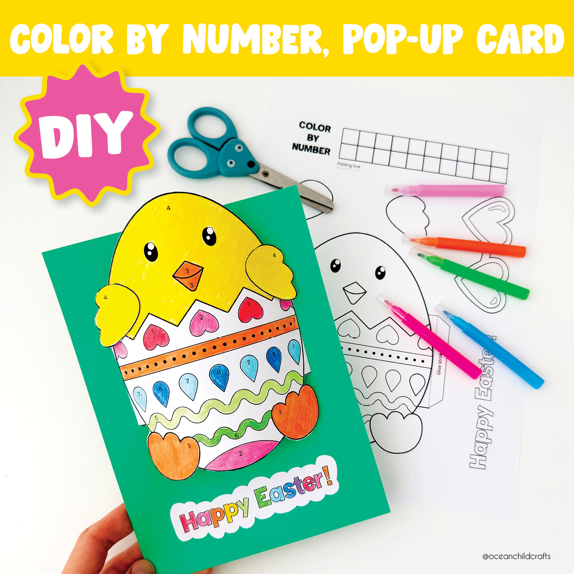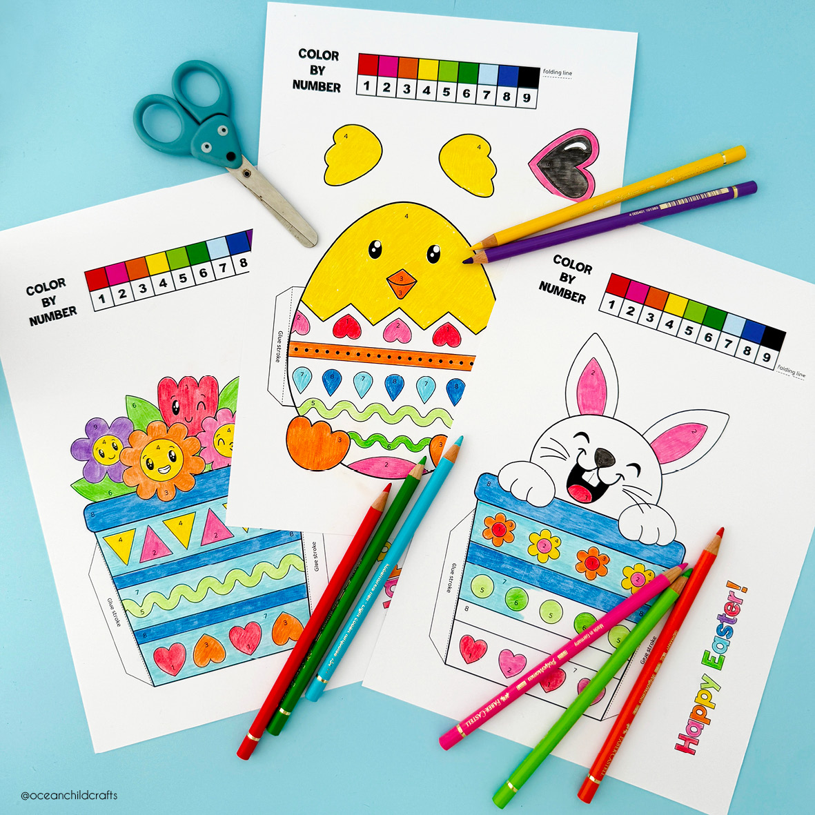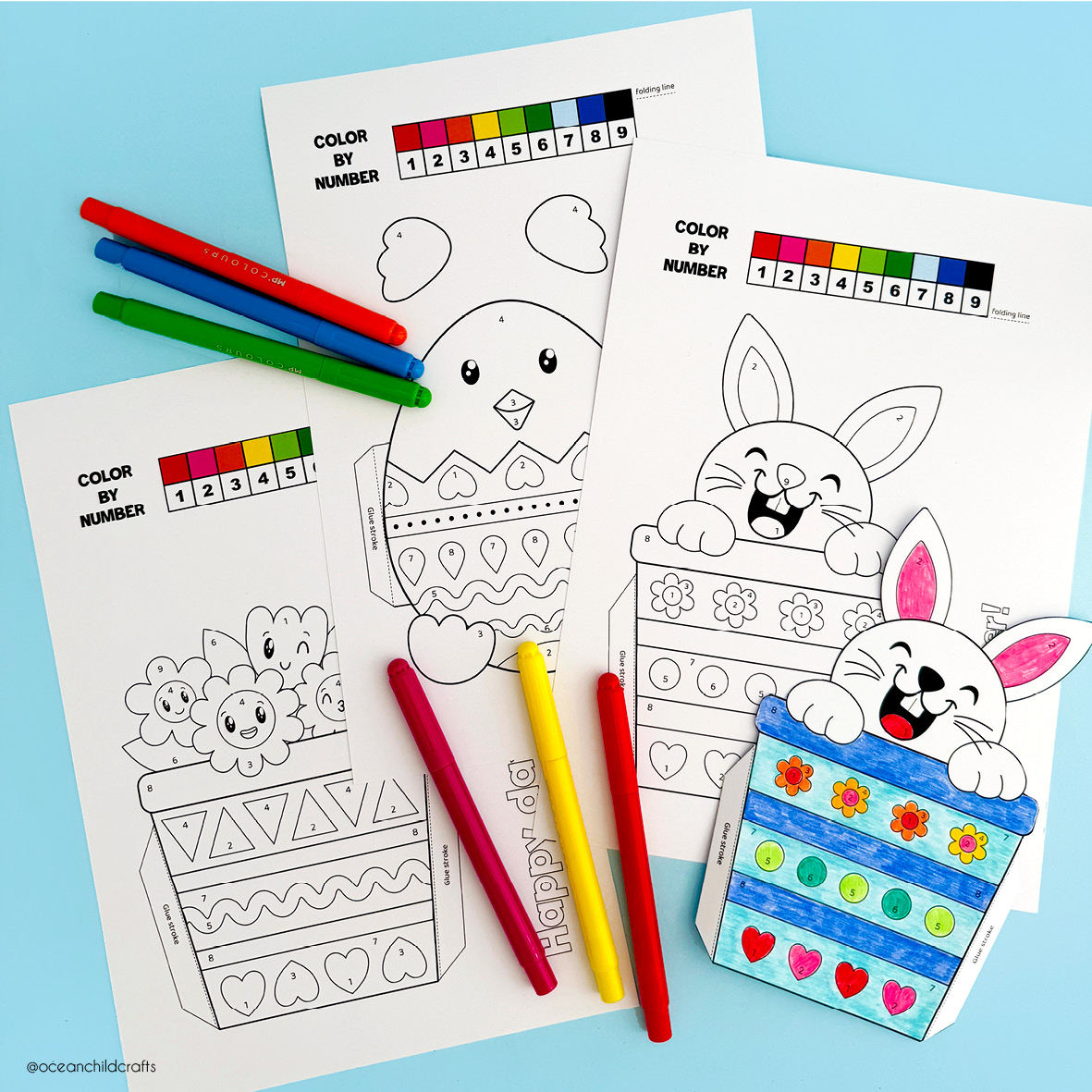 Decorate and color an Easter egg, flower pot or bunny basket while practicing number recognition skills. Identify the number and use the correct color to fill in the spring-themed illustration. You’ll create a beautiful Easter pop-up card to display or gift to a loved one. This project is perfect for both home and classroom settings.