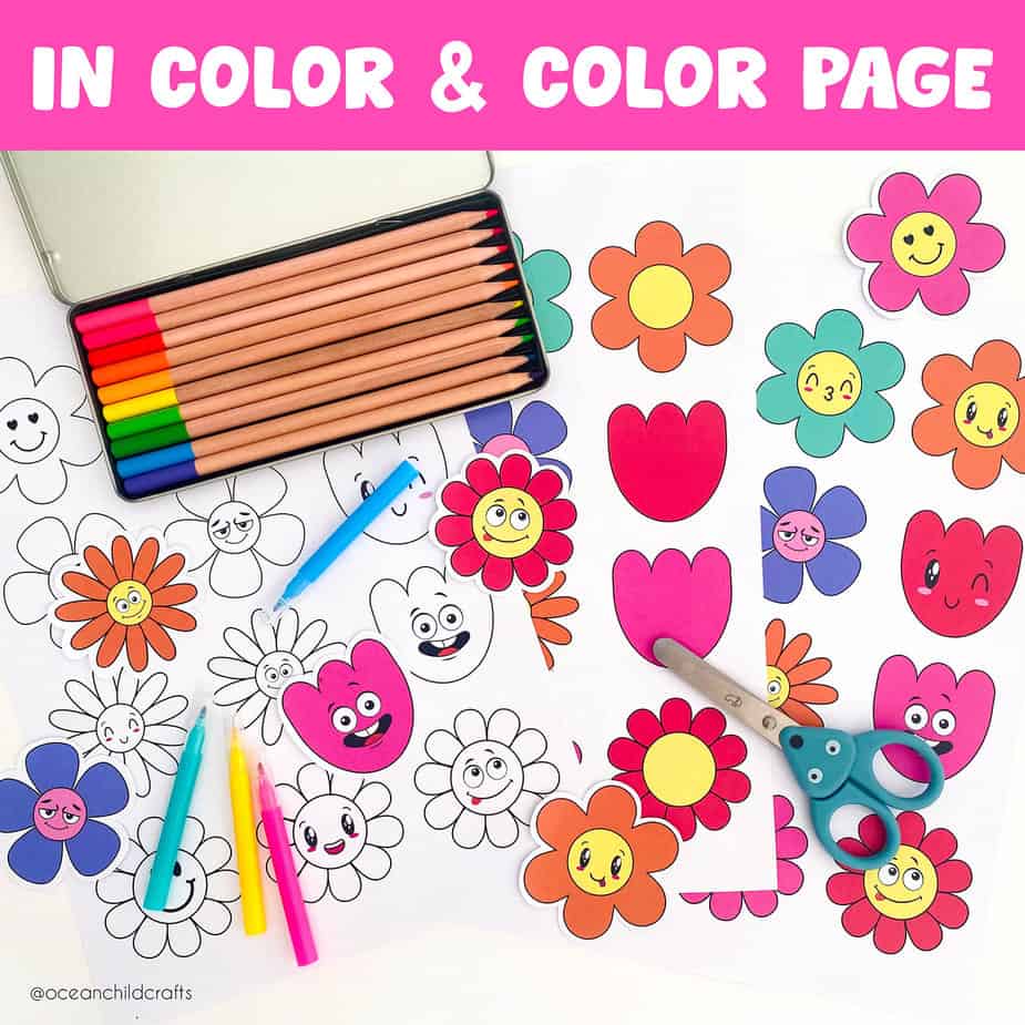 DIY flower craft printable, perfect DIY gift idea for a loved one. These happy flowers make a great classroom printable and an excellent birthday craft/gift idea. You will receive this creative printable in color and in black and white (color page). The flowers come with silly faces and without, and you get six different vases to choose from. Kids will end up with beautiful artwork to gift to a loved one. Also, check out our BIG craft printable bundle with ALL our craft/activity printables, including this flower craft activity.