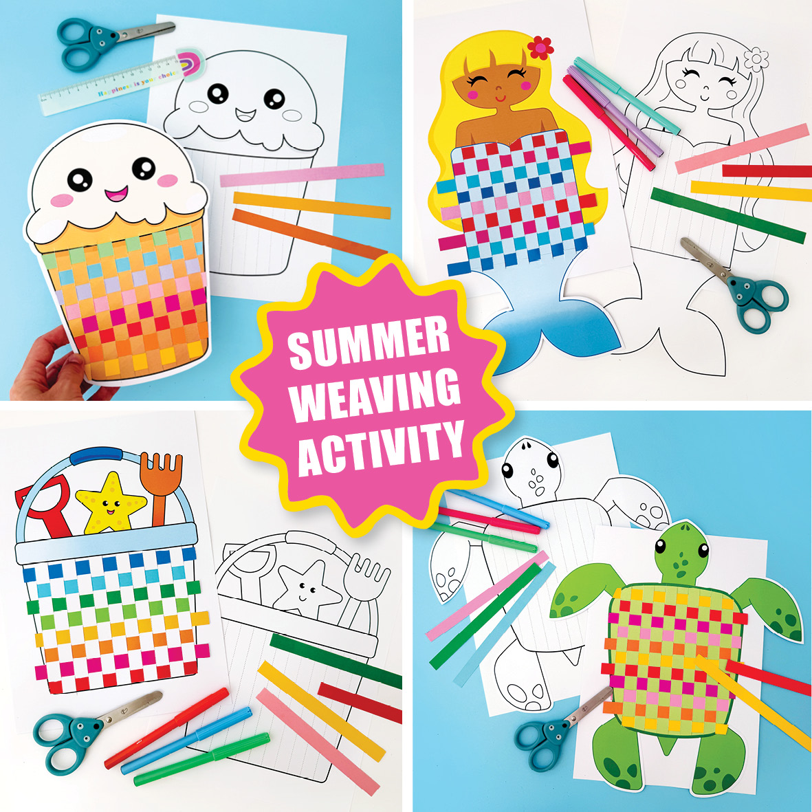 Try out this summer, beach/ocean-themed paper weaving craft bundle for kids. You receive four templates in color and coloring page: a mermaid, sea turtle, beach bucket and ice cream cone template in color and as a coloring page, giving kids the chance to add their unique touch!
