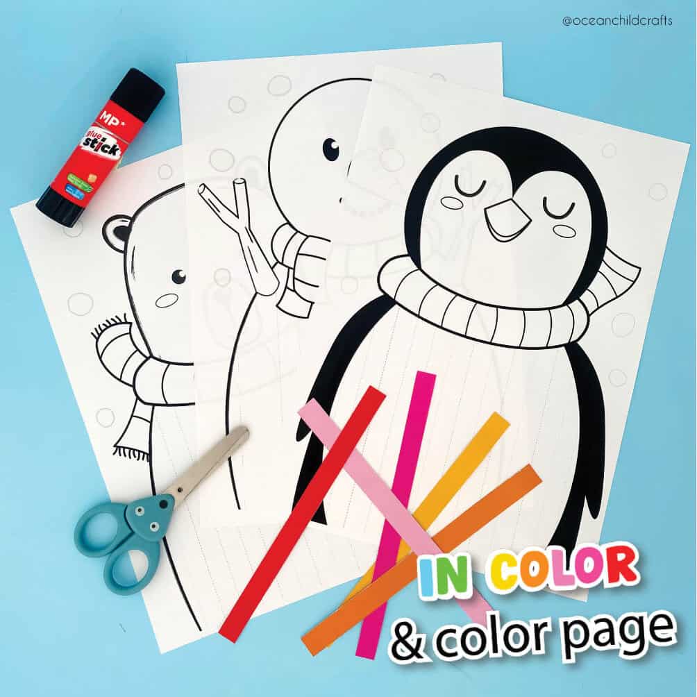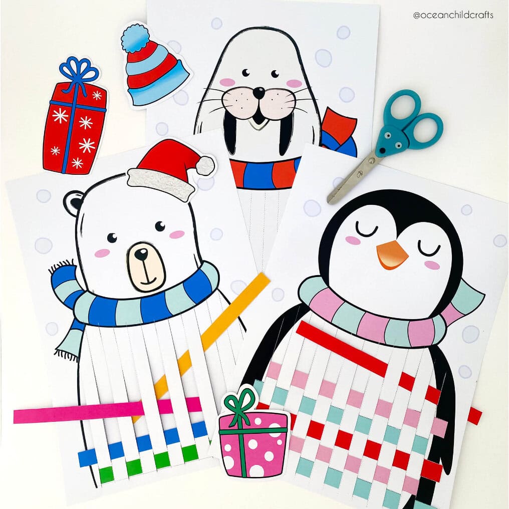 BIG bundle winter Sweater weaving craft printable for kids, preschool Christmas craft activity. You’ll receive five winter animal templates for sweater weaving. Each printable comes in color and a coloring page: Snow bunny, polar bear, seal, penguin, and snowman.