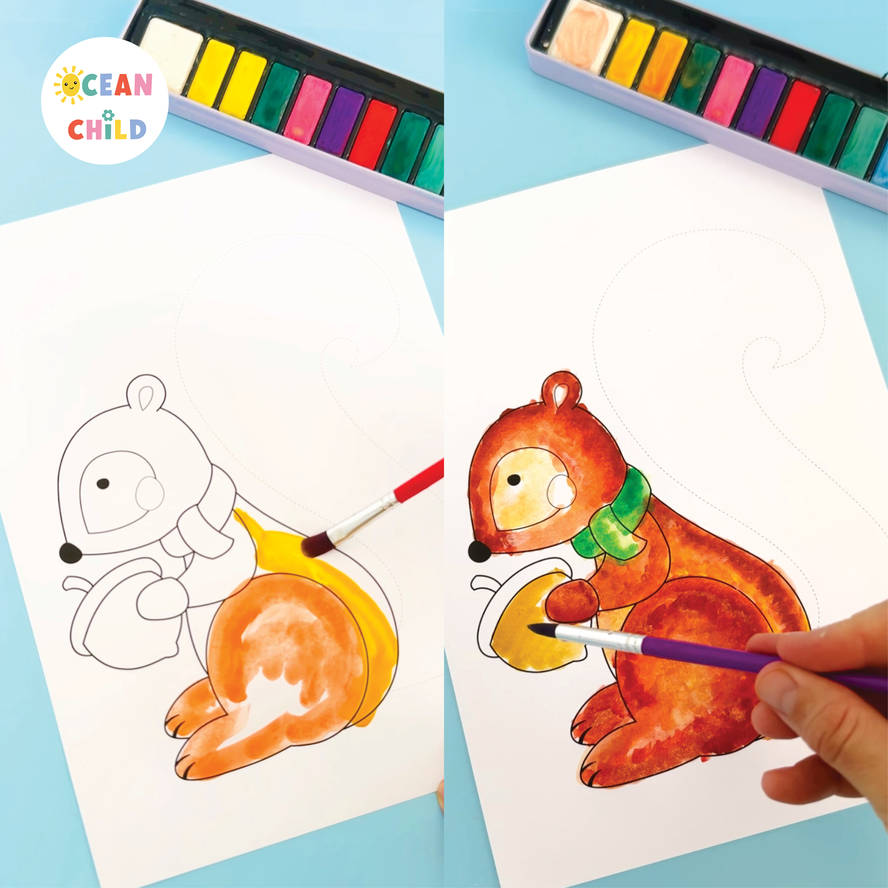 Sketch a simple sitting squirrel shape holding an acorn. Leave the tail section blank for now—that’s where the leaves will go! - Color the Squirrel